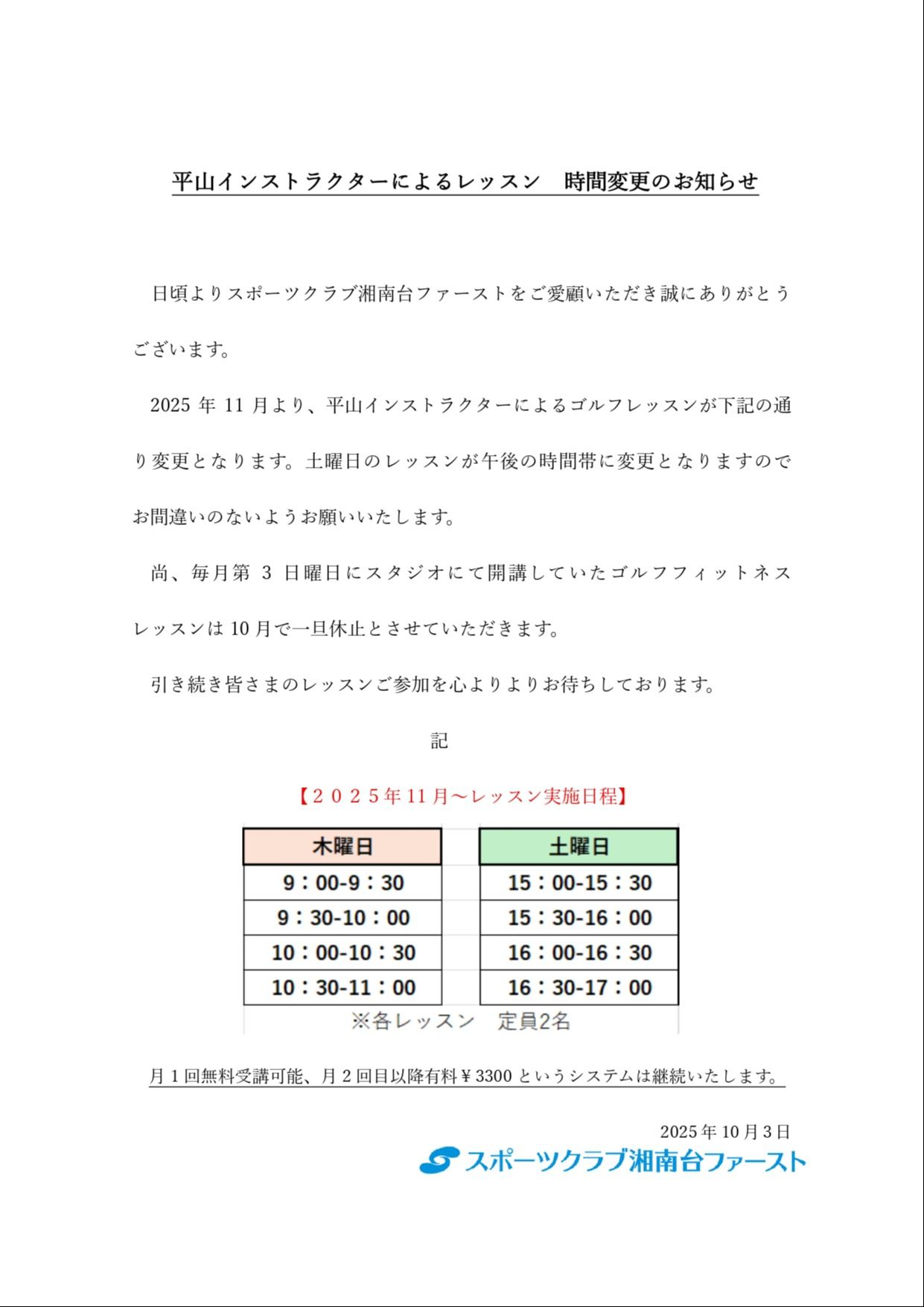 2025年11月よりゴルフレッスンの時間が変更となります。詳細は画像をご確認ください。引き続きゴルフレッスンへのご参加を心よりお待ちしております。