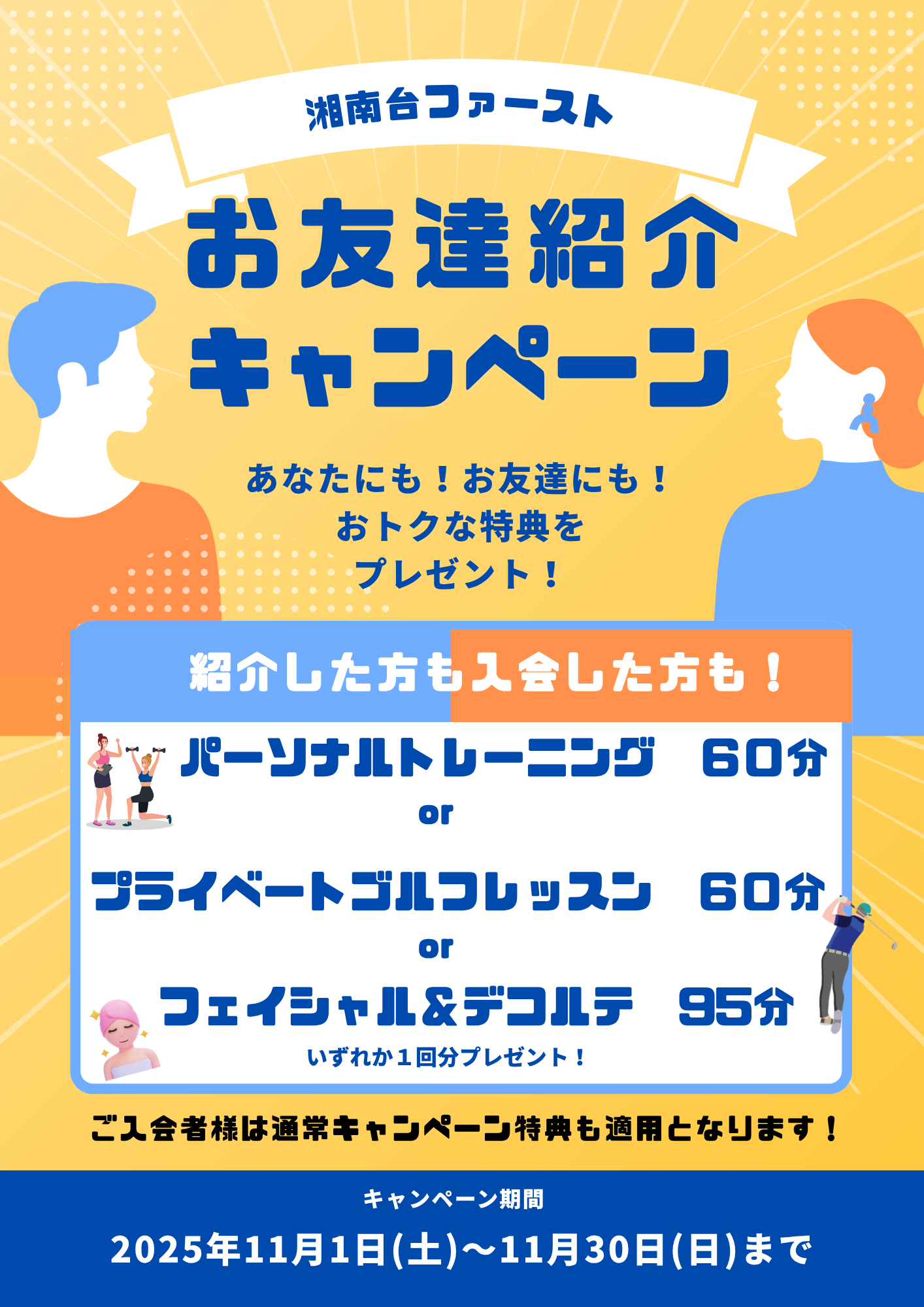 11月中にお友達・ご家族をファーストにご紹介いただきますと、ご紹介者様もご入会者様も6600円相当のマンツーマンセッションが受けられます!この機会にぜhご紹介ください!