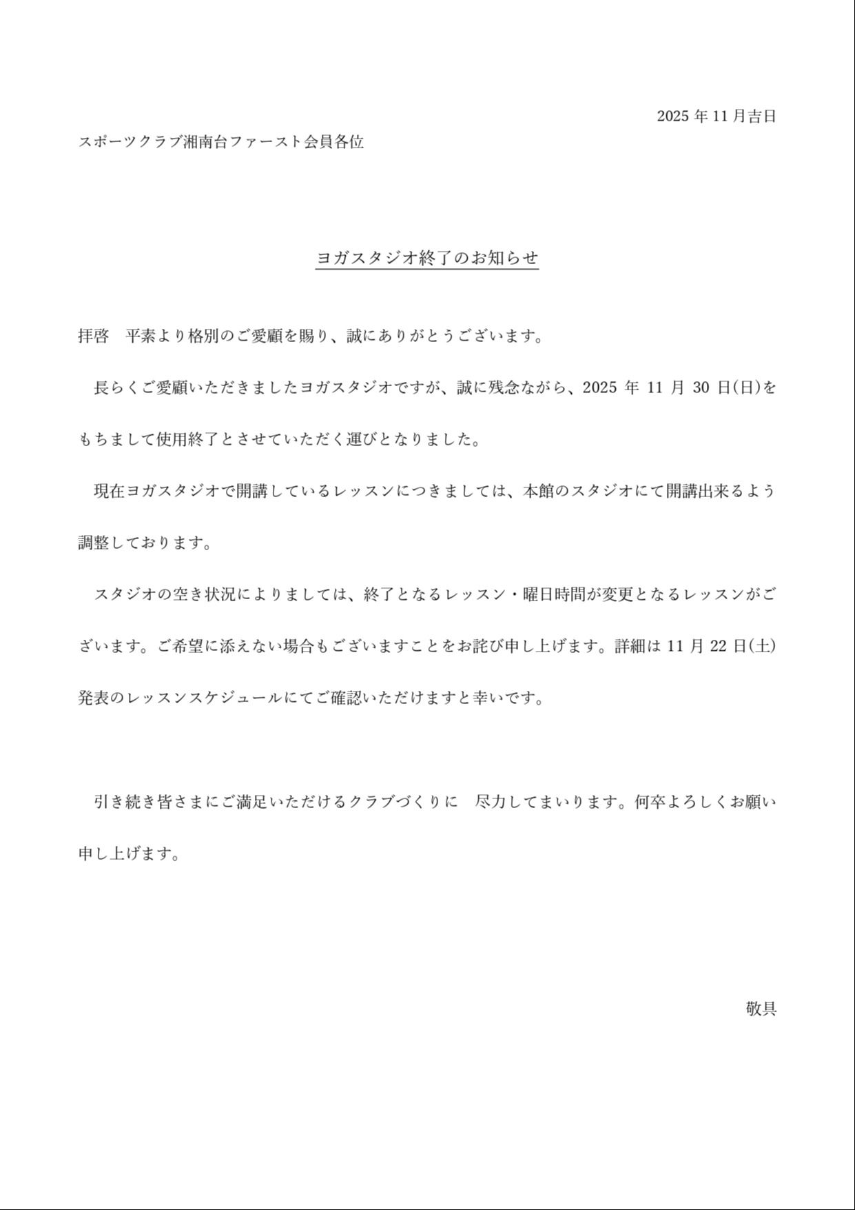 日頃よりスポーツクラブ湘南台ファーストをご愛顧いただき誠にありがとうございます。長年ご愛顧いただきましたヨガスタジオの使用が11月末にて終了となります。