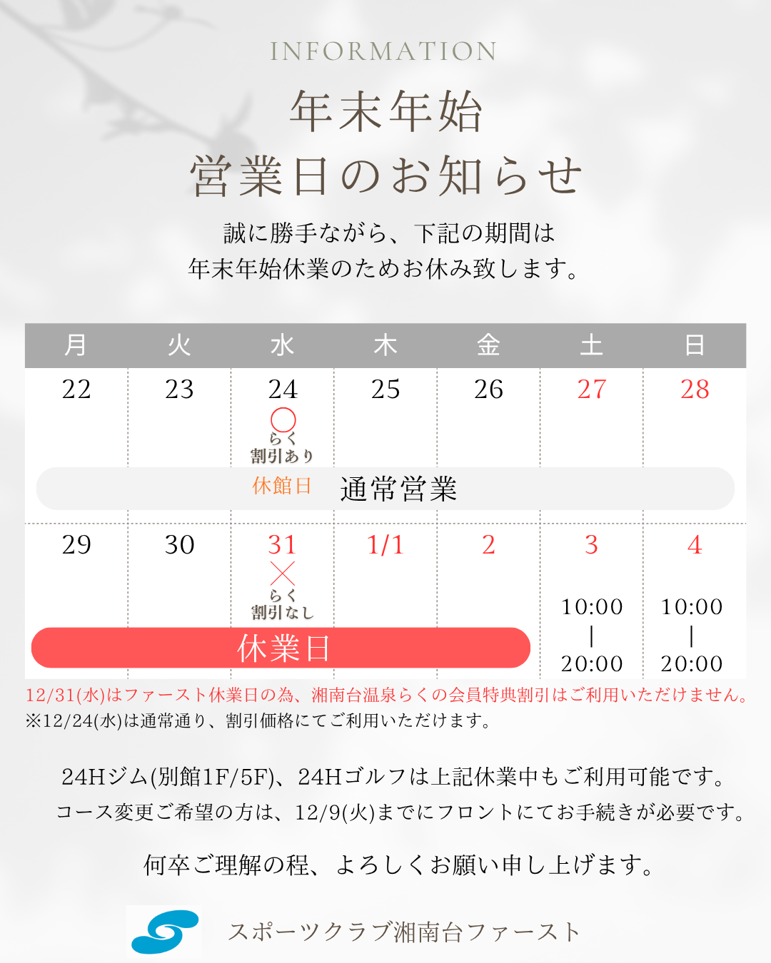 ※12/31(水)はファースト休業日の為、湘南台温泉らくの会員特典割引はご利用いただけません。
