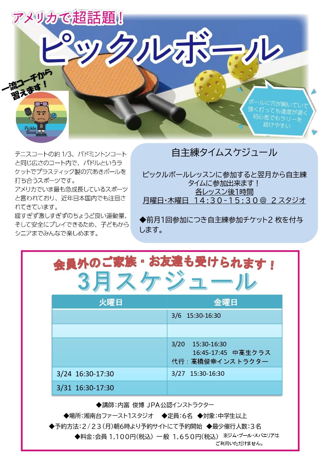 3月のピックルボールスケジュールをお知らせいたします!2/23(月)朝6:00からご予約スタートです。ご家族お友達をお誘い合わせの上、ぜひご参加ください!