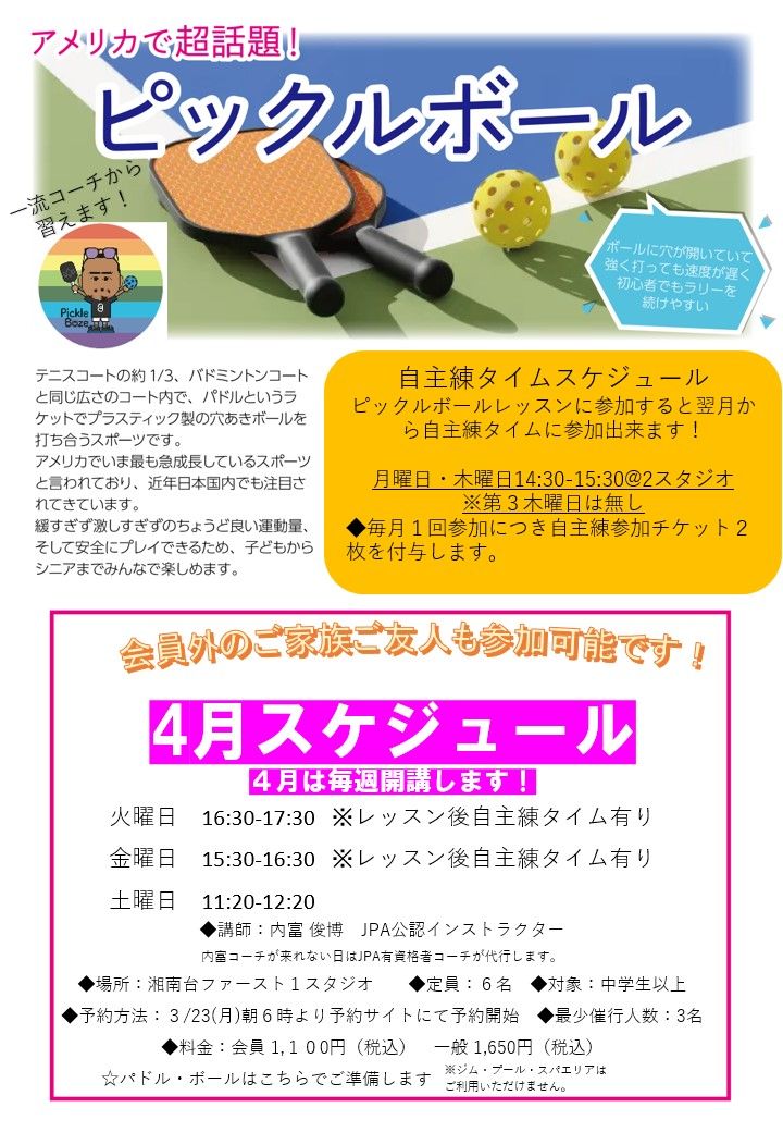 4月のピックルボールスケジュールをお知らせいたします🎵レッスンは前日18時までに最少催行人数3名に満たない場合は中止とさせていただきます。自主練タイムは1名から参加可能です。4月もみんなでピックりましょう~