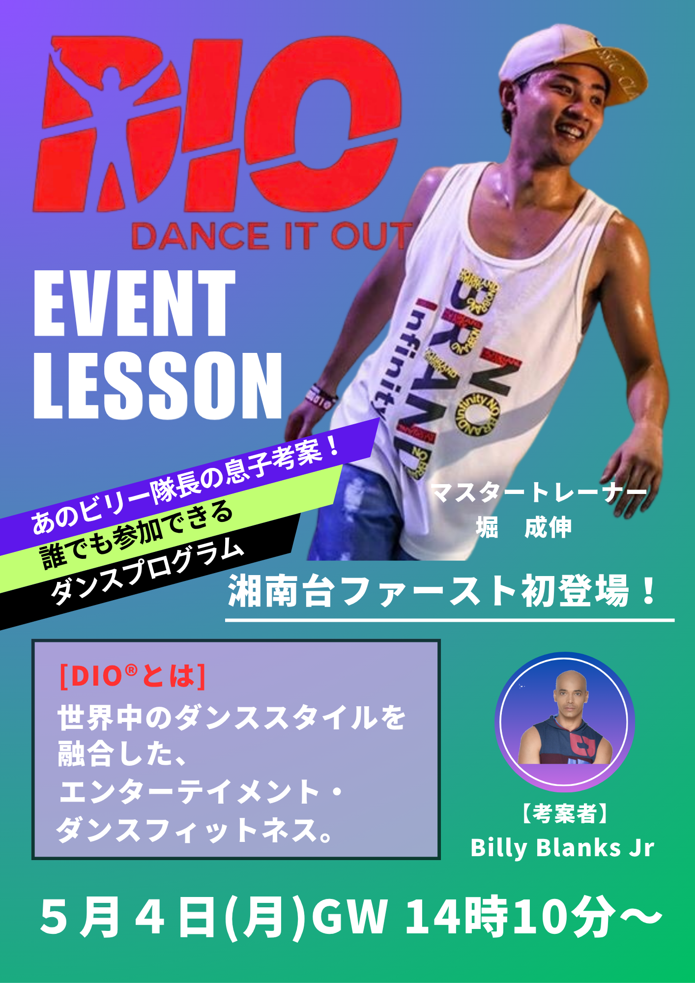 GWはファーストのイベントレッスンで盛り上がりましょう!あのビリー隊長の息子さんが考案したダンスプログラム「DIO®」がついにファースト上陸!マスタートレーナーの資格を持つ堀インストラクターが担当します!この機会にぜひご参加ください😊